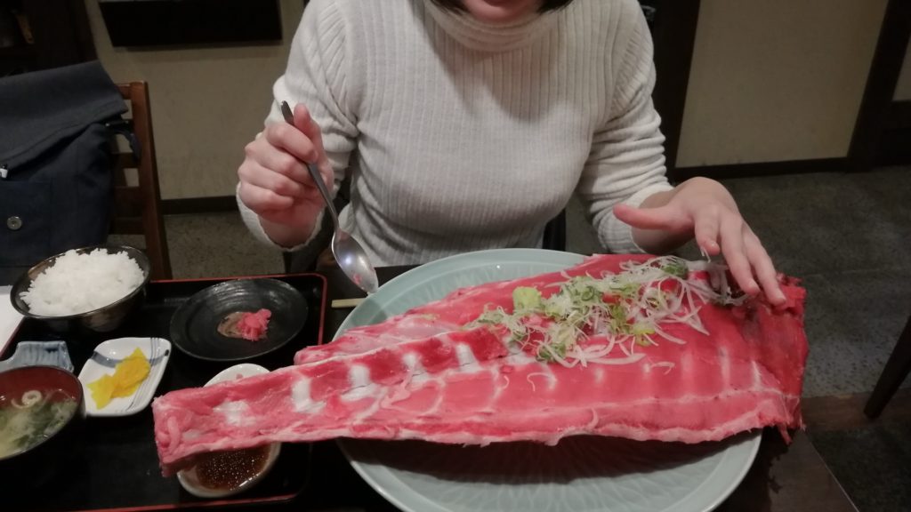 スプーンで身をこそぎ取る。一口食べて、またこそぐ。その繰り返しが思った以上に続く。食べても食べてもなくならないのではないかと思うほどマグロを満喫できる。しかも、こそぐ場所によって脂の量や味が少し異なって無限に楽しめる。