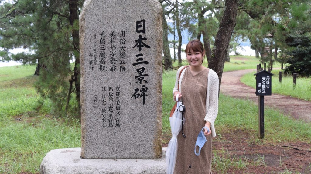 駐車場から歩いて日本三景碑の前へ。まずはここで一度立ち止まって天橋立に来たことを実感する。記念写真を撮っている人もいるけど、順番待ちになるほどではなくて落ち着いた雰囲気だった。