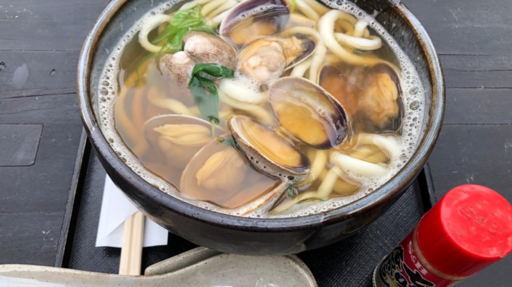 もう一品はあさりうどん。こちらはあっさりした味ながら、あさりの旨みがしっかりと出ている美味しいうどんだった。風のある海辺を歩いて少し冷えた体にちょうど良いメニューで、こちらも満足のいく内容だった。