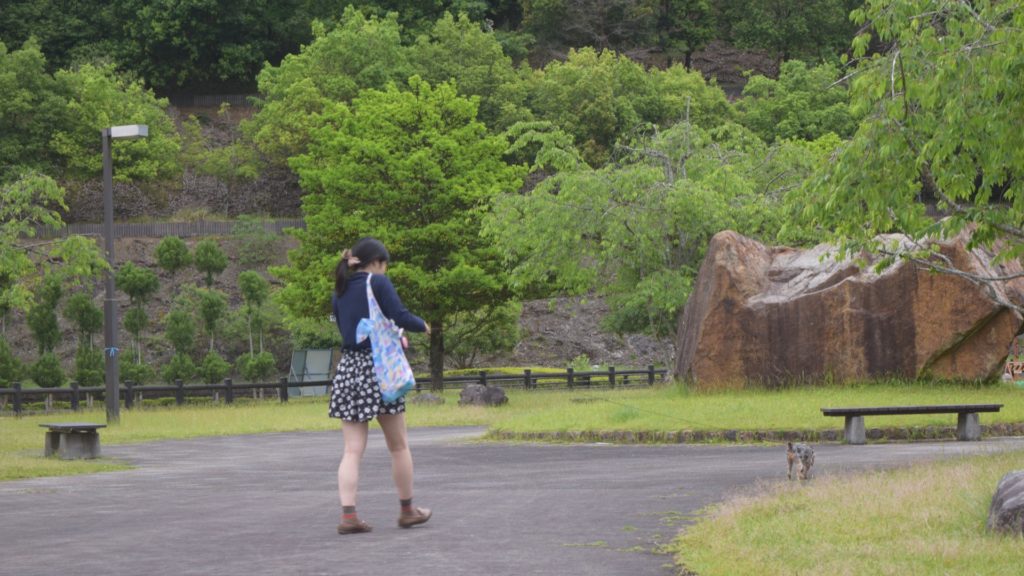 愛犬と一緒に歩き始める。足元は整備されていて歩くこと自体に気を取られることはない。人の姿はほとんど見えず、気軽に散歩をすることができる。ただ前を向いて同じ方向へ歩いていく時間が続く。