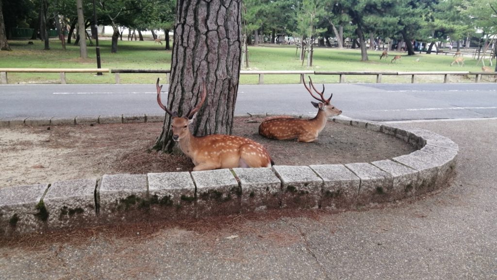 夏場は日陰が多くて鹿たちも木陰で休んでいる姿が目立つ。人も自然と同じ場所に集まる。場所によっては人と鹿が同じ日陰で休んでいたりして少し面白い。珍しい光景を見ることができるし体験することもできる。
