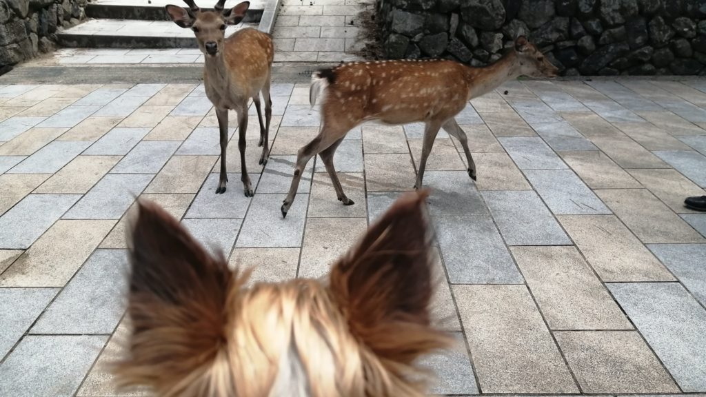 鹿のほうはというと愛犬の存在など気にも留めていない様子。この温度差がこの場所の日常なのだと思えた。鹿にとっては犬のような動物は天敵だけど、ヨークシャーテリアぐらいの小型犬には警戒心すら抱かないらしい。