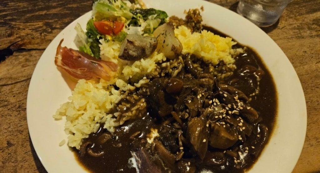 友人はエゾ鹿肉カレーのキノコトッピングを注文。こちらもやっぱりボリューム満点。ゴロっと入ったエゾ鹿肉が食べ応えあり。エゾ鹿肉はカレーのスパイスでかなり軽減されているけど若干の獣臭さがあってジビエの雰囲気を味わうことができる。