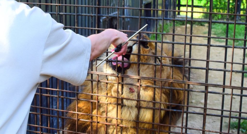 イベント限定だけどライオンや狼への餌やり体験もできる。生肉を前に睨みつけてくる。なかなかの迫力。