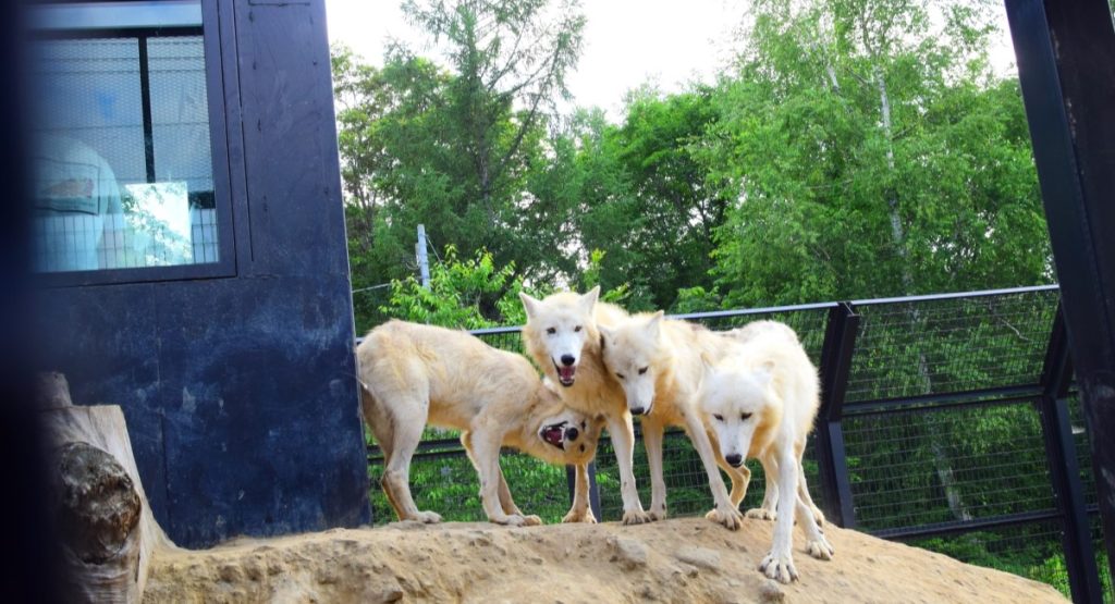 4頭の狼が飼育されていた。睨み合い威嚇し合いじゃれ合ってるだけでも怖い。こうしてみると犬と狼は違うんだなーと感じる。とにかく迫力がすごい。喧嘩が始まった時は怖すぎた。