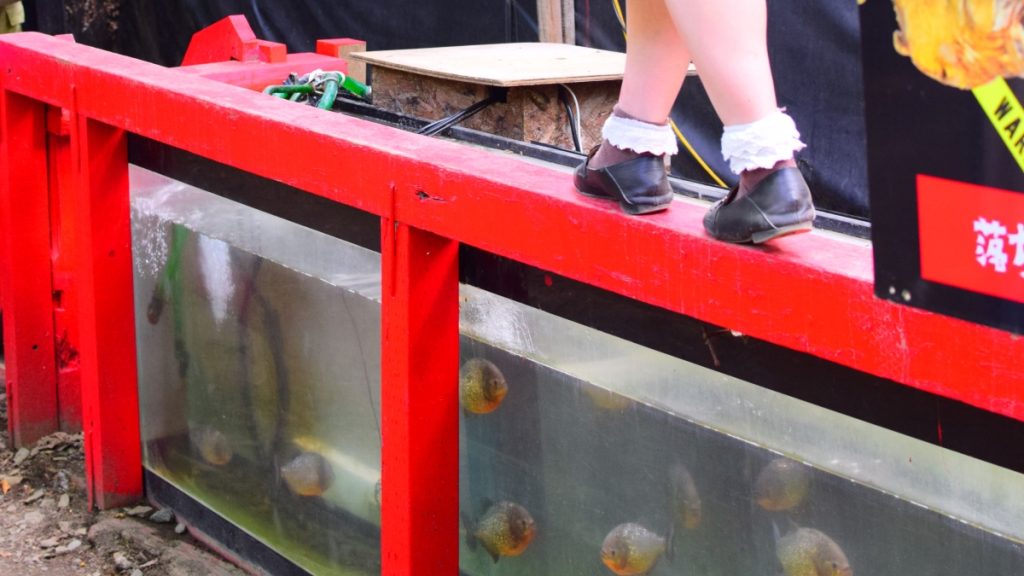 ピラニアたっぷりの水槽が!しかも足場が平均台ぐらい細い!!落ちたらピラニアの餌食になるとかならないとか⋯⋯。