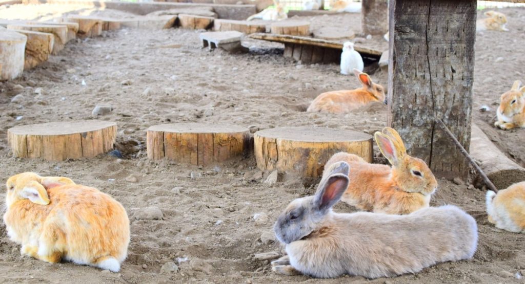 そこにはたくさんのうさぎちゃん達!モフモフで可愛いけど、暑さでだらけ気味。横を歩いても写真を撮っても、バイクや車が小屋の横を駆け抜けてもノーリアクション。たくましいうさぎちゃん達。