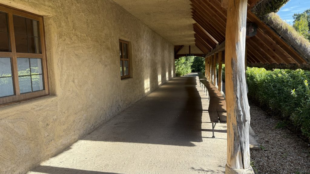 建物の前まで来るとベンチが並ぶ軒下休憩スペースがあった。カフェでもバームクーヘンを食べられるけど、テイクアウトでバームクーヘンを購入してここで食べるのも気候によっては良さそう。雰囲気がすごく良くてちょっとの間座ってた。