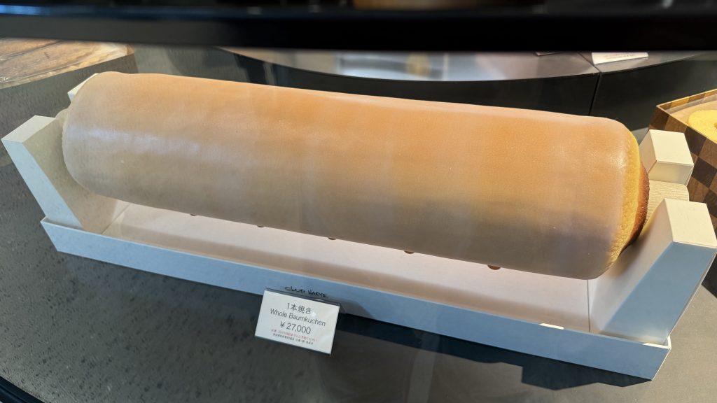 いろんなバームクーヘンがあったけど、その中でも圧倒的な迫力だったのが1本焼き。焼いたバームクーヘンをカットせずに一本丸々買えるらしい。