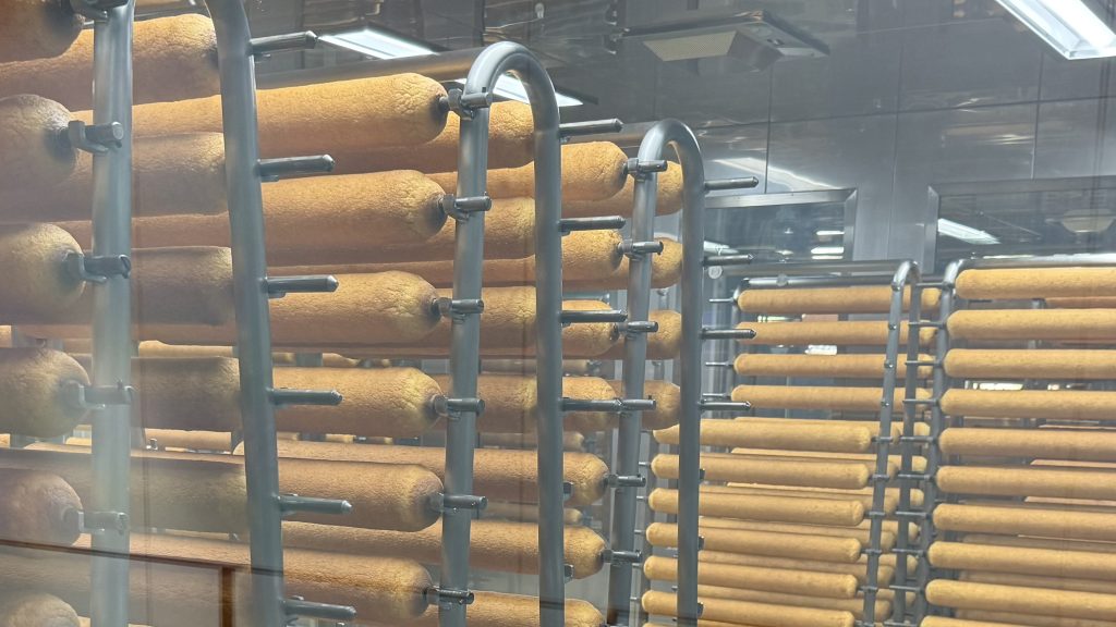すると現れたのがバームクーヘン工場。大量のバームクーヘンが並んでいてすごい光景。圧巻のバームクーヘン。