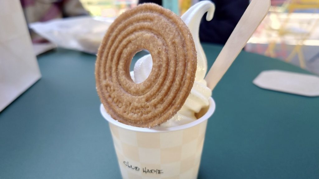 次にバームクーヘンとは異なるスイーツを買ってみた。買ったのはソフトクリームにバームクーヘン生地のクッキー的なものを乗せた最高の組み合わせのスイーツ。甘くて甘くて甘くて⋯⋯とっても美味しい。