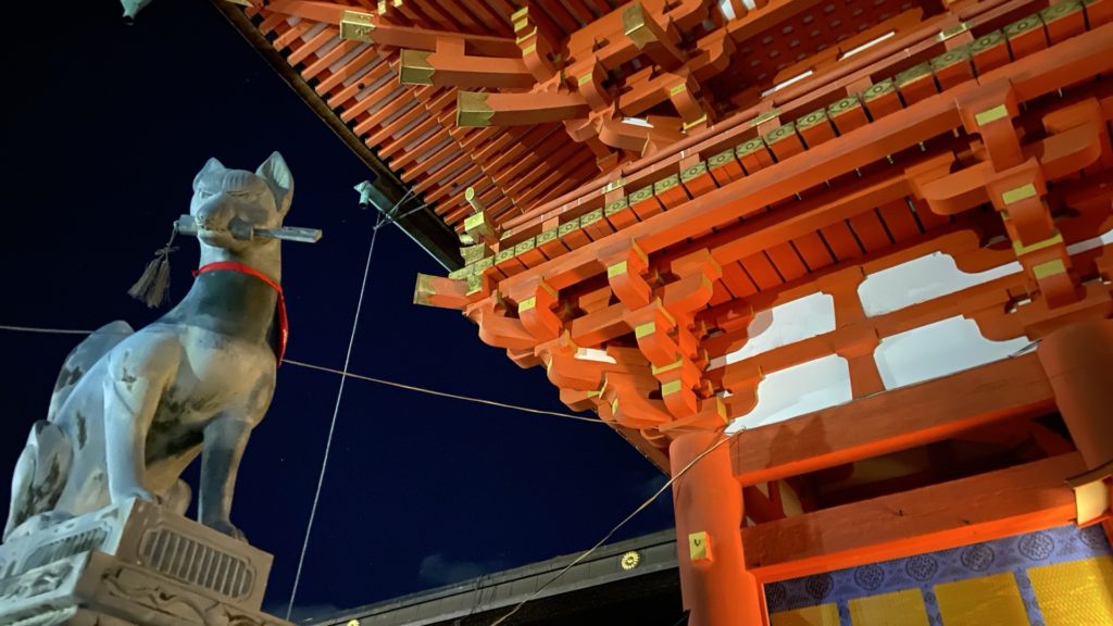 楼門を見上げると朱色の構造がより強調されて見える。昼間は人の視線や動きに惑わされて意識しない細部も、夜だとはっきりと目に入る。近くには神様の眷属たる狐像が鎮座している。こちらも昼間よりも存在感が増している気がする。