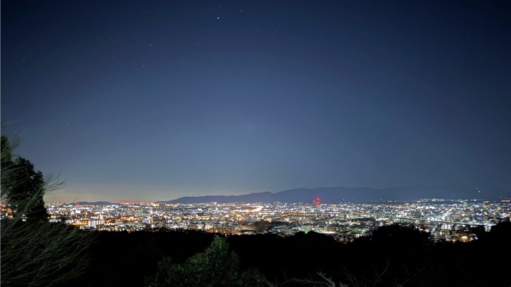 千本鳥居を進んでいく途中に視界が開ける場所がある。そこで立ち止まると京都市内の夜景が遠くに広がっていた。緊張感が続いていた分、この景色は少しほっとする。下に見える街の灯りは静かで、深夜三時という時間帯らしい落ち着いた光だった。